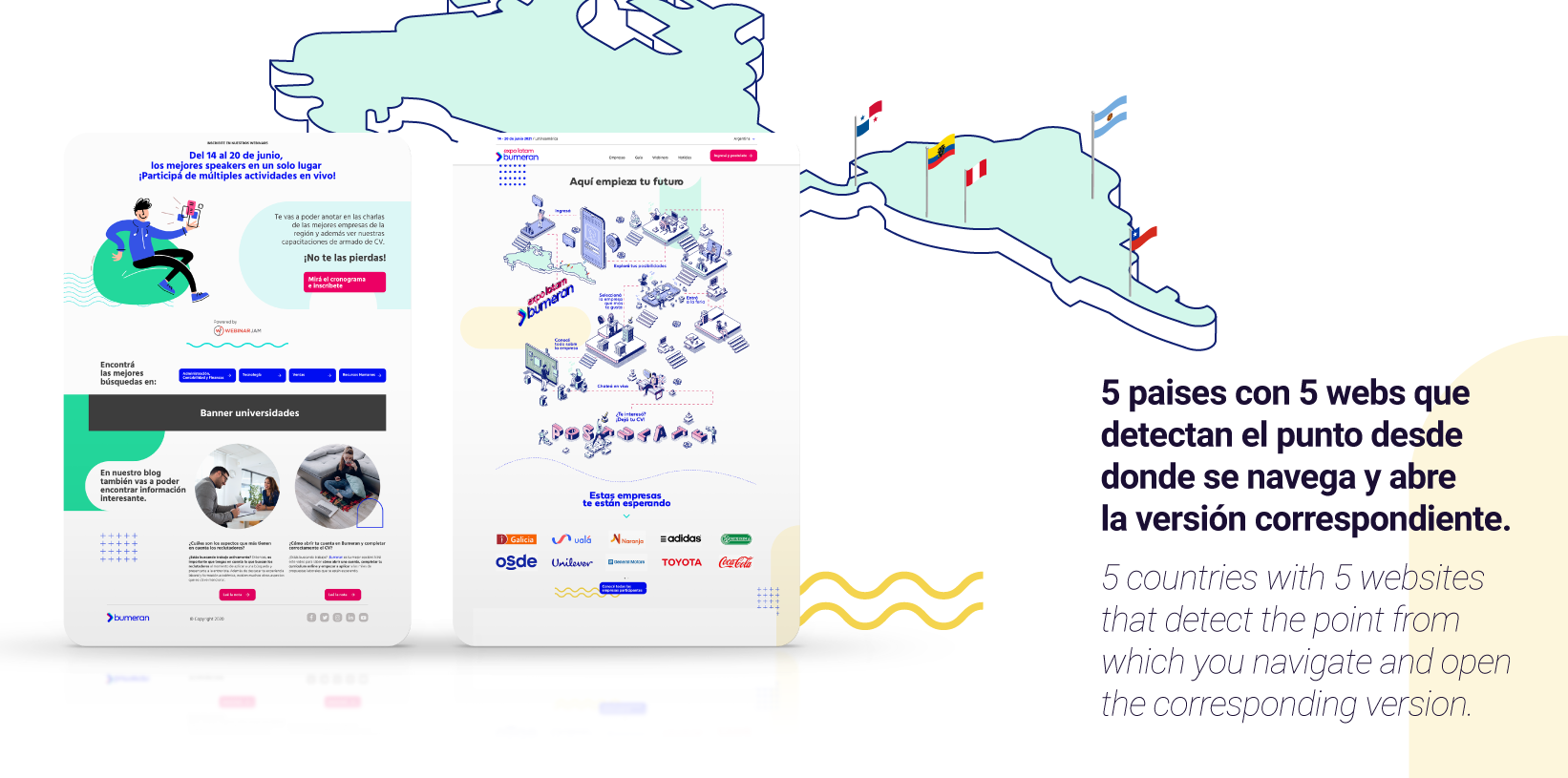 Together with Bumeran, we worked on the development of a launch pre landing for the Expo Latam website, the most important job fair in Latin America, under the 5 most important countries in the region: Argentina, Chile, Ecuador, Panama and Peru. We implemented 5 websites with language variations and companies, each user accesses the corresponding website through their location, in this way each country has its own nearby website.