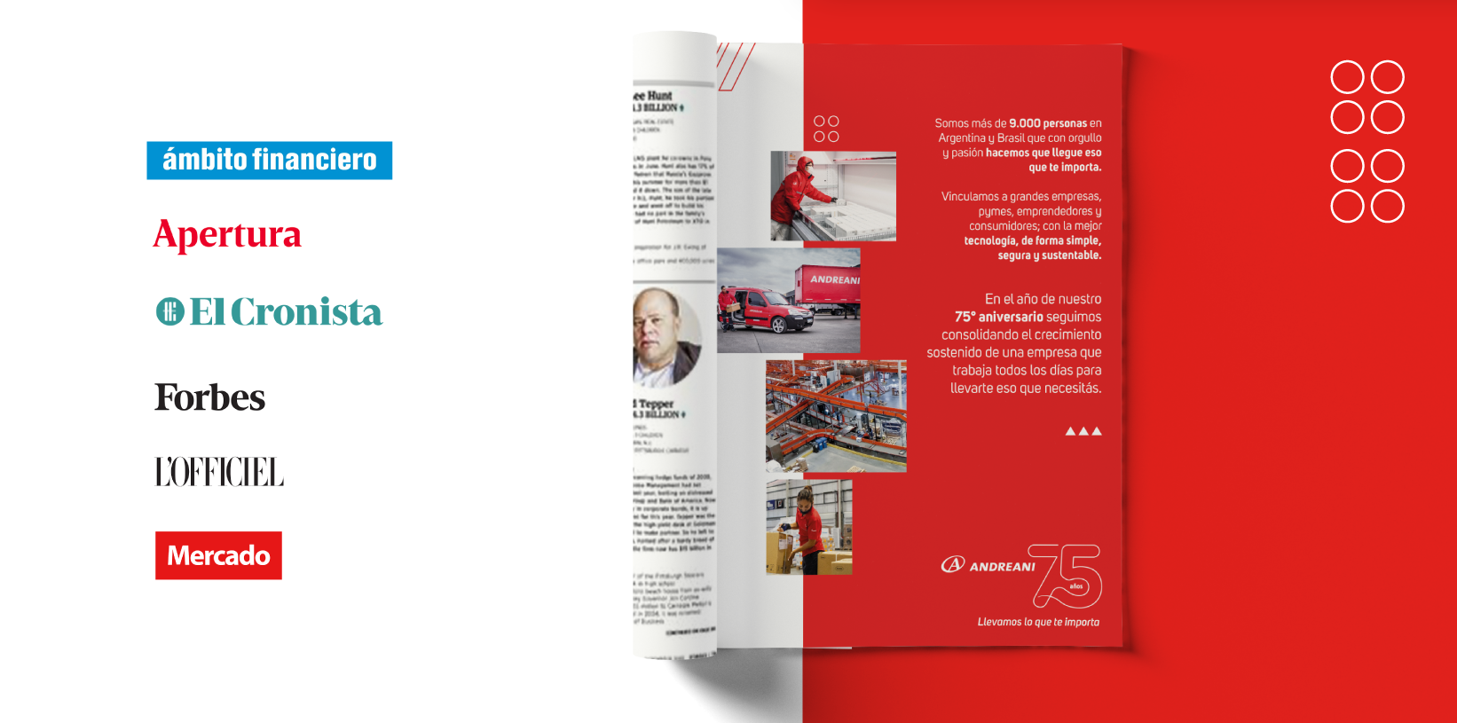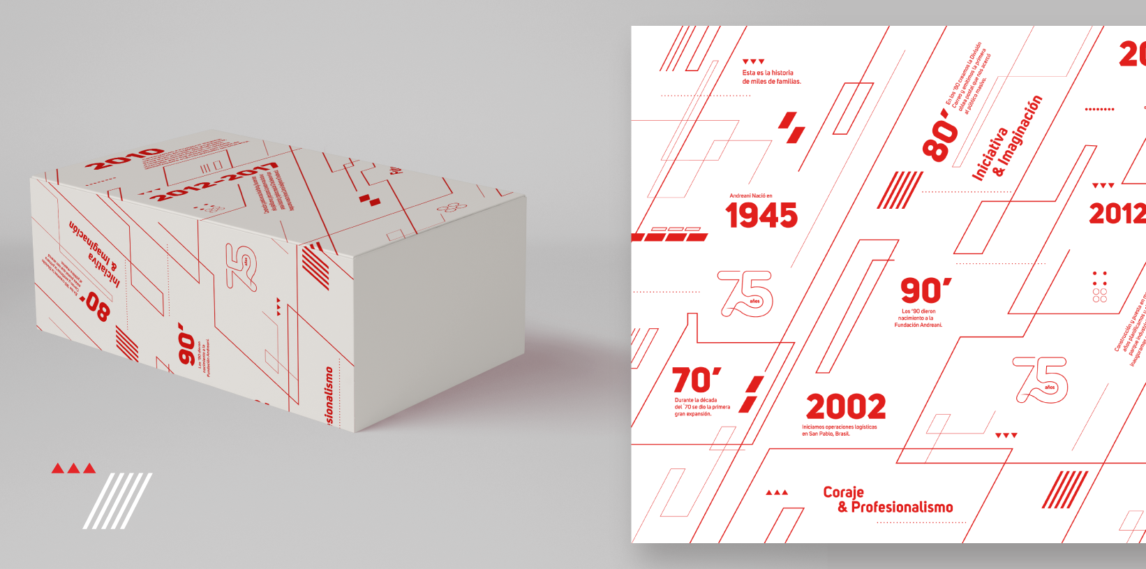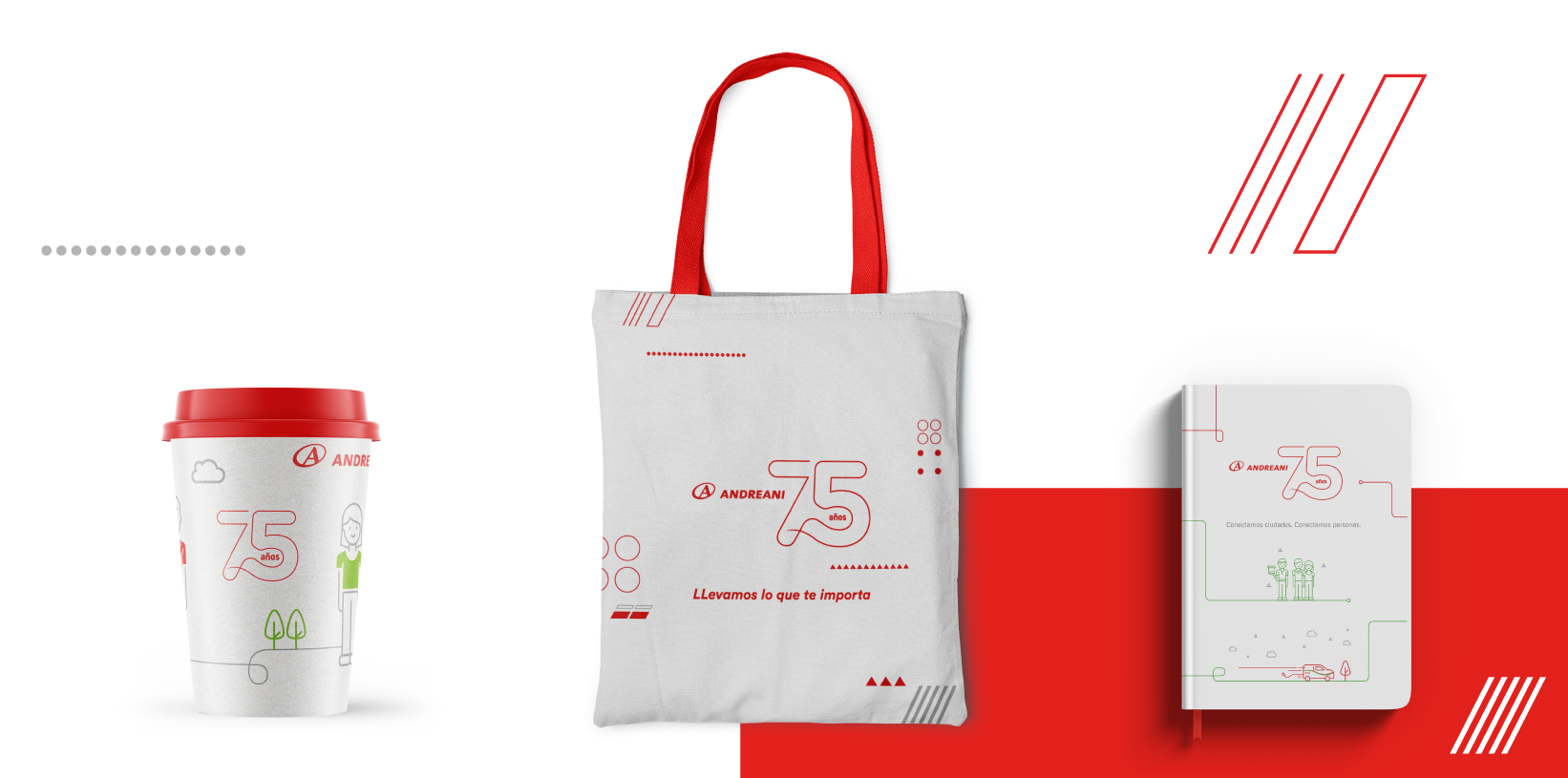 Desarrollamos el sello que acompaña a Andreani durante la celebración de sus 75 años, este sello acompaña a la marca en avisos, banners, piezas de merchandising y piezas de comunicación interna. El objetivo del sello fue llegar a una identidad que acompaña al logo de la compañía de manera orgánica y versátil.